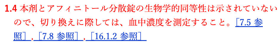 7. 用法及び用量に関連する注意〈結節性硬化症〉7.5 本剤とアフィニトール分散錠の生物学的同等性は示されていない。本剤とアフィニトール分散錠の切り換えに際しては、切り換えから 2週間後を目安に血中トラフ濃度を測定すること。