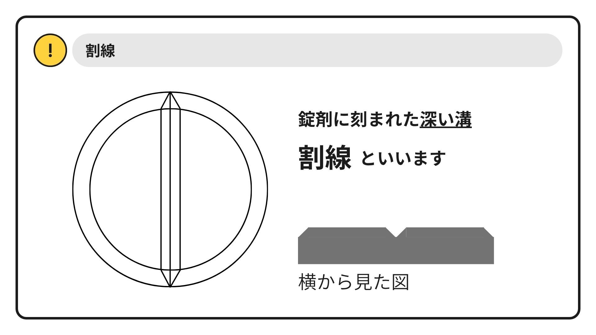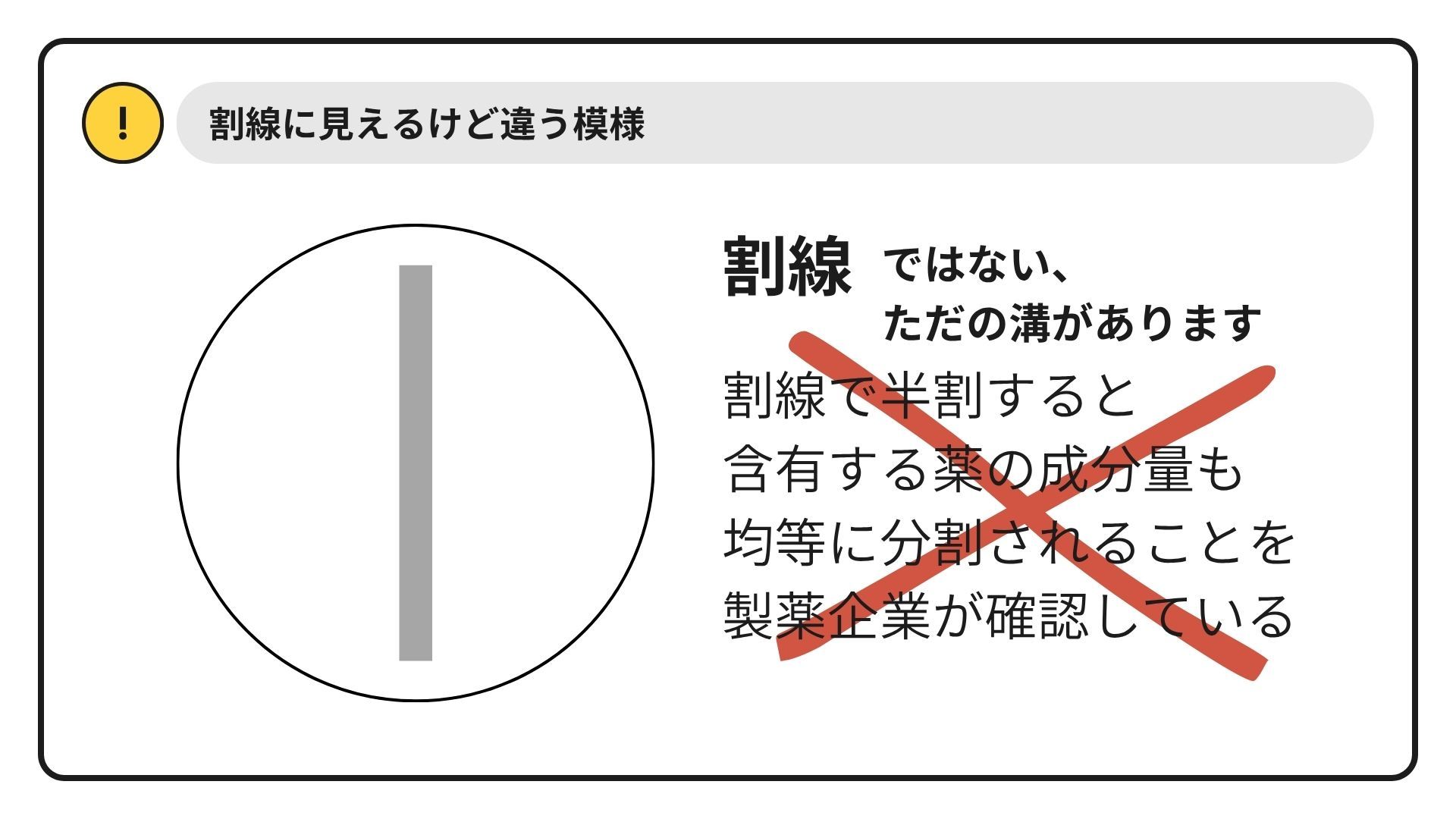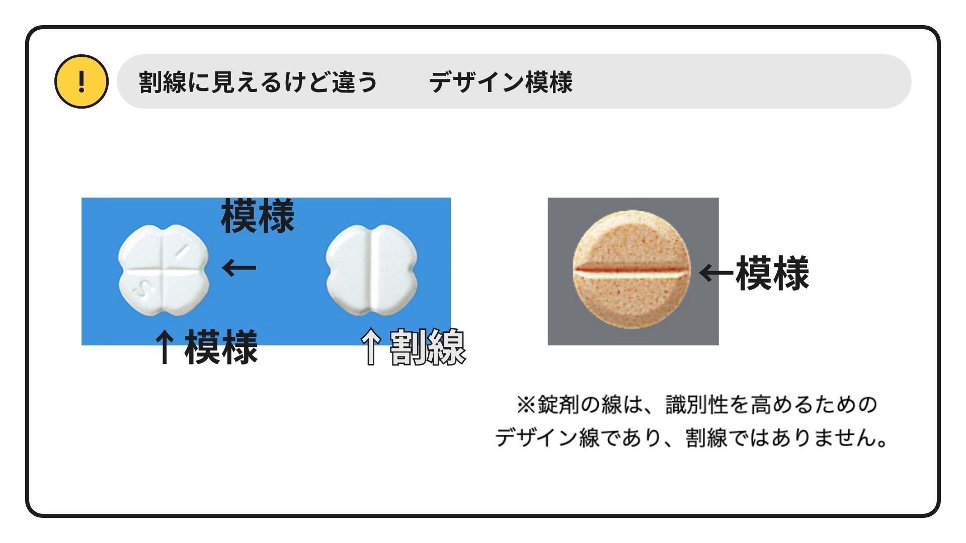 ここに示した他に、「CR」等、特性を示す記号があり、半割・粉砕不可の医薬品もあるため注意