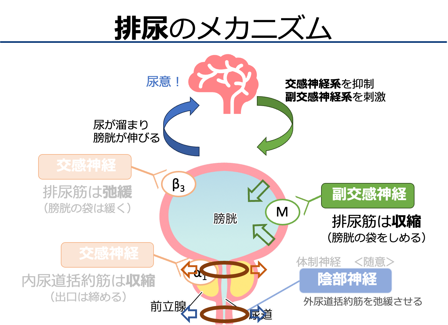 - 膀胱平滑筋(排尿筋)の収縮を促進(袋を閉めて尿を押し出す)