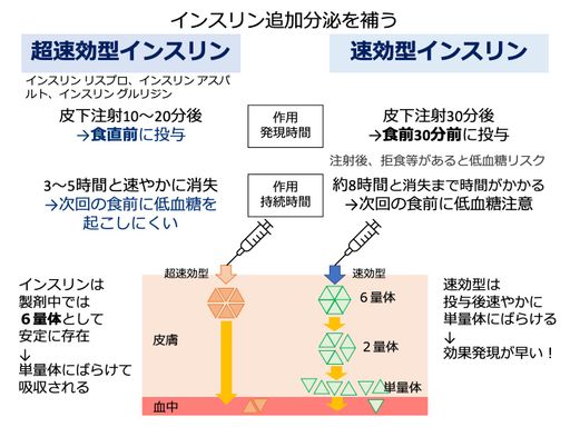 - 代表例としては以下があります:超速効型インスリン アスパルト(製品名:Fiasp®)、超速効型インスリン リスプロ(製品名:Lyumjev®)