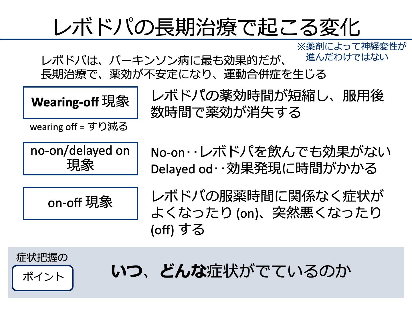 - ジスキネジア(過剰運動)、ウエアリングオフ、オン‐オフ現象
