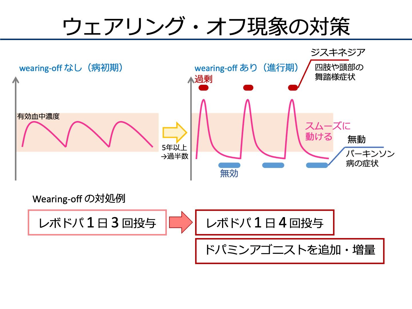 - 定義:次回の投与時刻が近づくにつれて薬効が切れ、運動症状(固縮・無動など)が再発する。