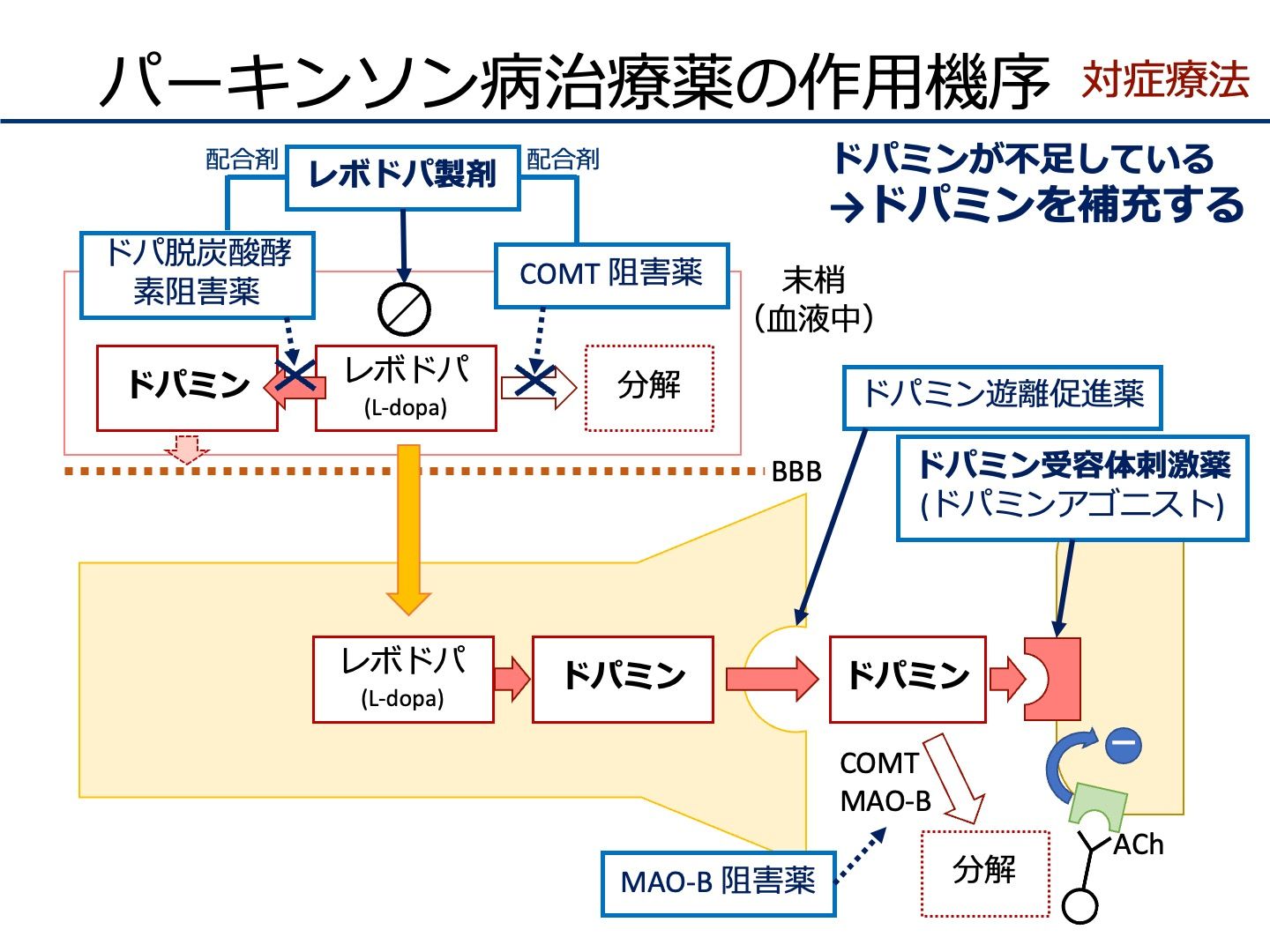 - L-ドパ(レボドパ)投与 → 血液脳関門を通過し中枢神経内でドパミンに変換 → ドパミン不足を補充