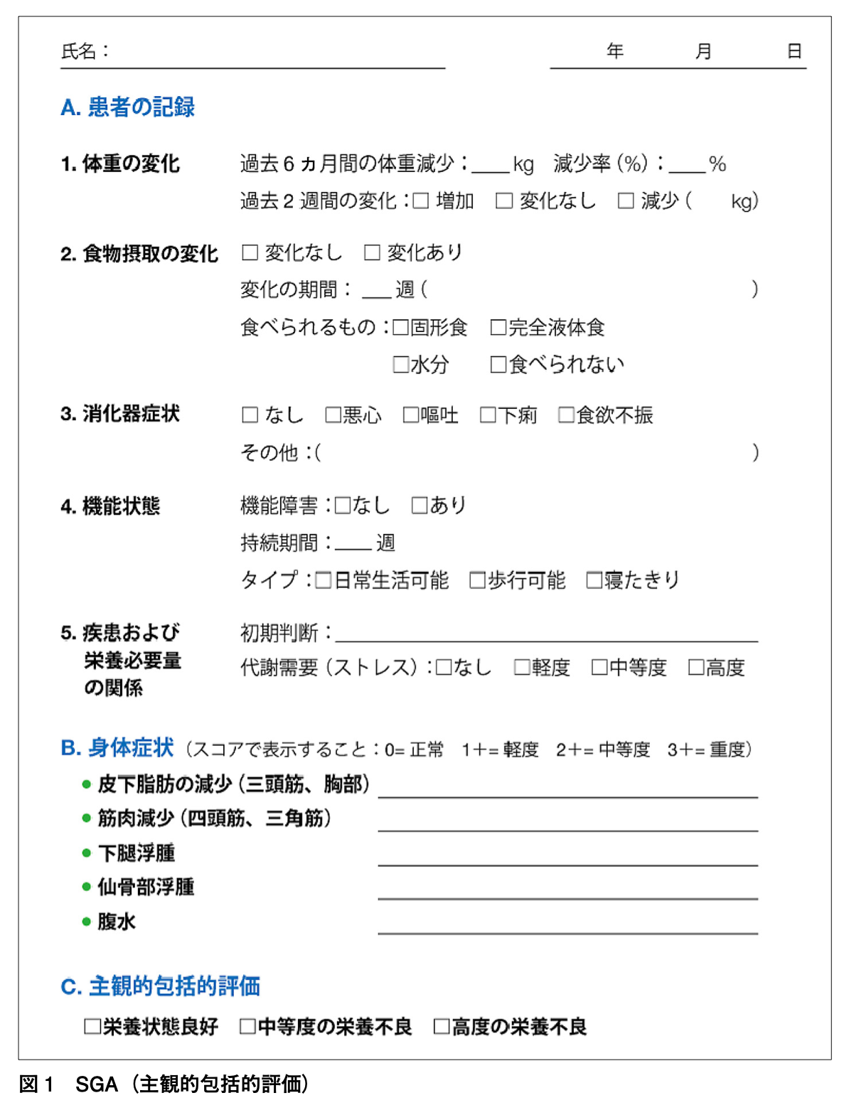 SGA(Subjective Global Assessment、主観的包括的評価)は日本では最も使用されてきた栄養評価ツールの一つです。SGA は、本来アセスメントツールですが、日本では、スクリーニングとアセスメントを同時に行えるツールとして、GLIM基準を用いるようになる前までは、広く使われてきました。