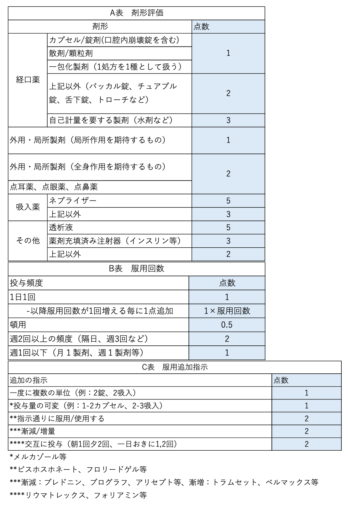 合計スコアが高いほど処方が複雑と判定され、服薬アドヒアランス低下や有害事象リスク上昇との関連が指摘されています。