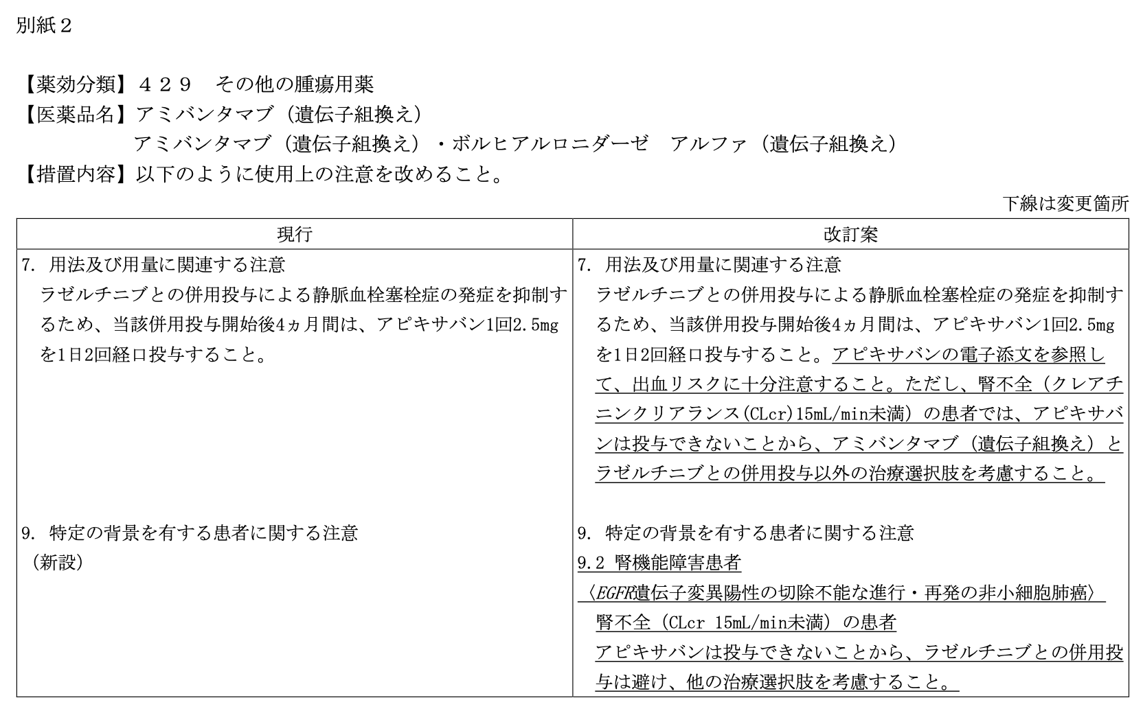 7. 用法及び用量に関連する注意7.2 ラゼルチニブとの併用投与による静脈血栓塞栓症の発症を抑制するため、当該併用投与開始後4カ月間は、アピキサバン1回2.5mgを1日2回経口投与すること。アピキサバンの電子添文を参照して、出血リスクに十分注意すること。ただし、腎不全(クレアチニンクリアランス(CLcr)15 mL/min未満)の患者では、アピキサバンは投与できないことから、アミバンタマブ(遺伝子組換え)とラゼルチニブとの併用投与以外の治療選択肢を考慮すること。[1.4 参照][8.3 参照][9.1.2 参照][9.2.1 参照][11.1.4 参照]