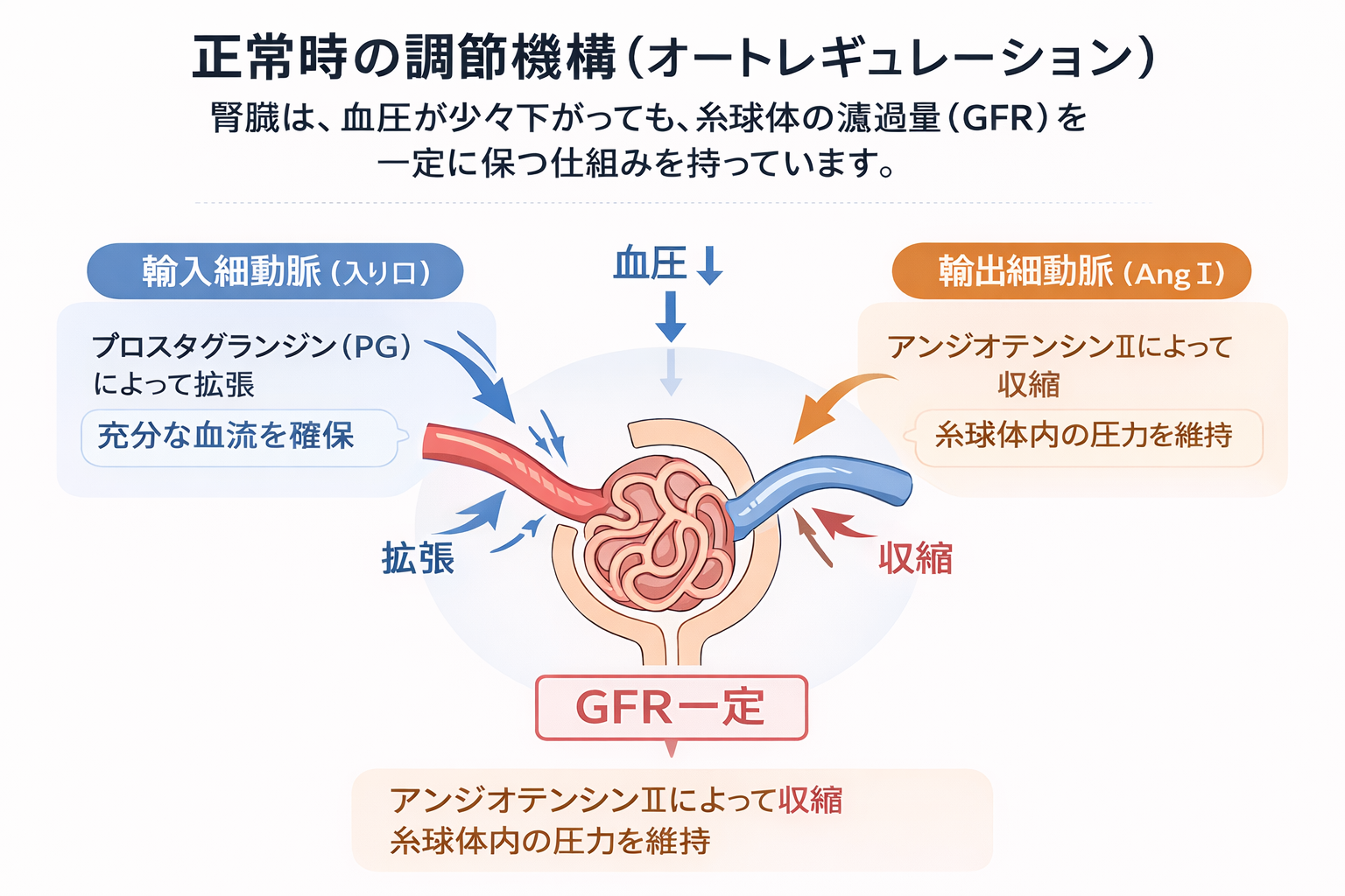 腎臓は通常、血圧が多少低下しても オートレギュレーション によりGFRを維持します。