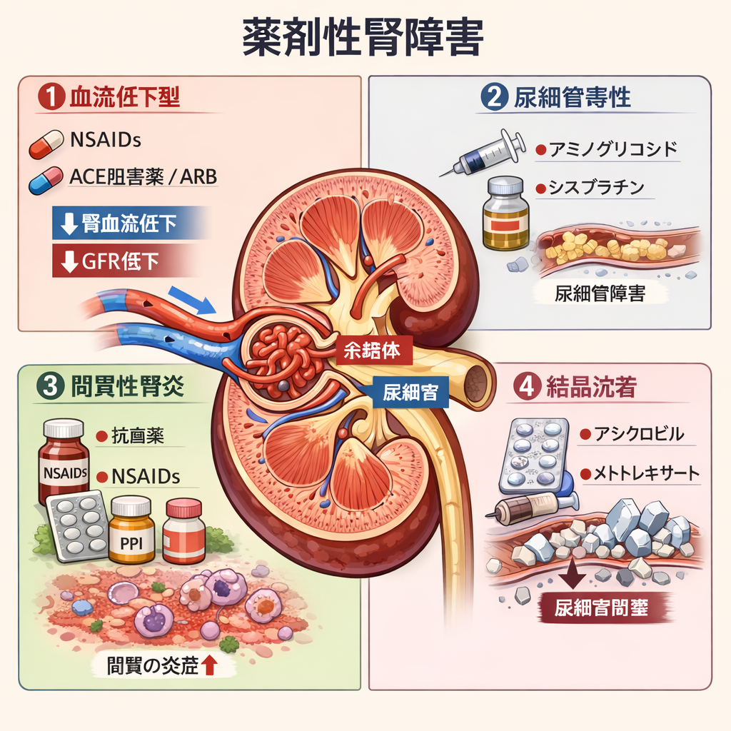 | NSAIDs | PG合成阻害 | 輸入細動脈収縮 |