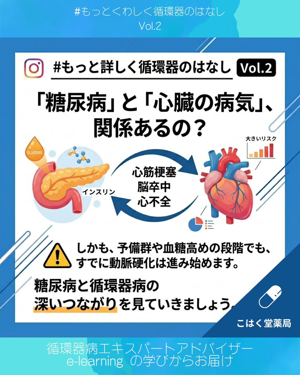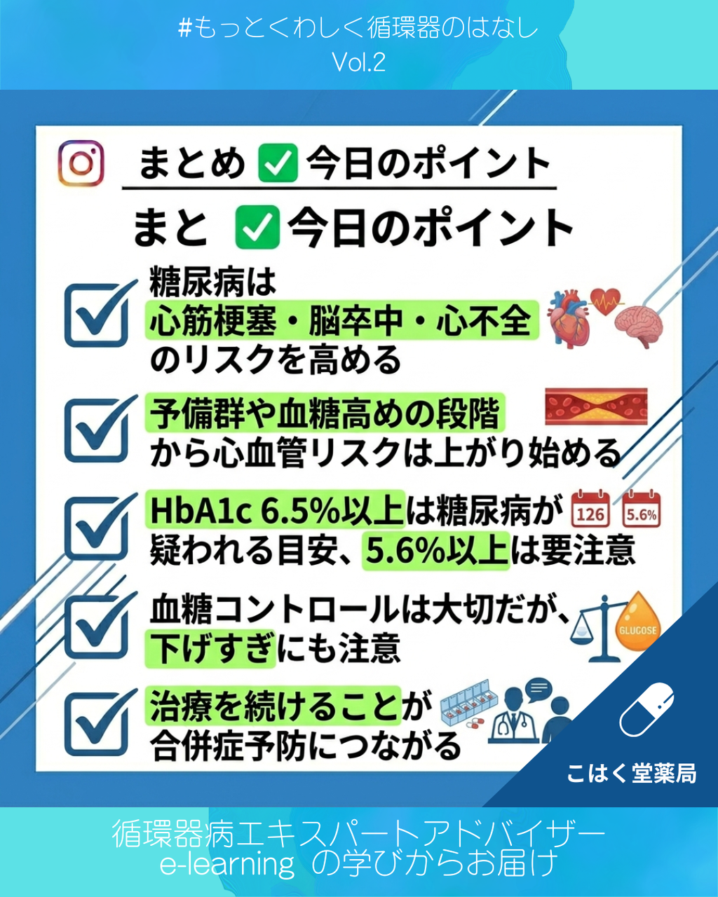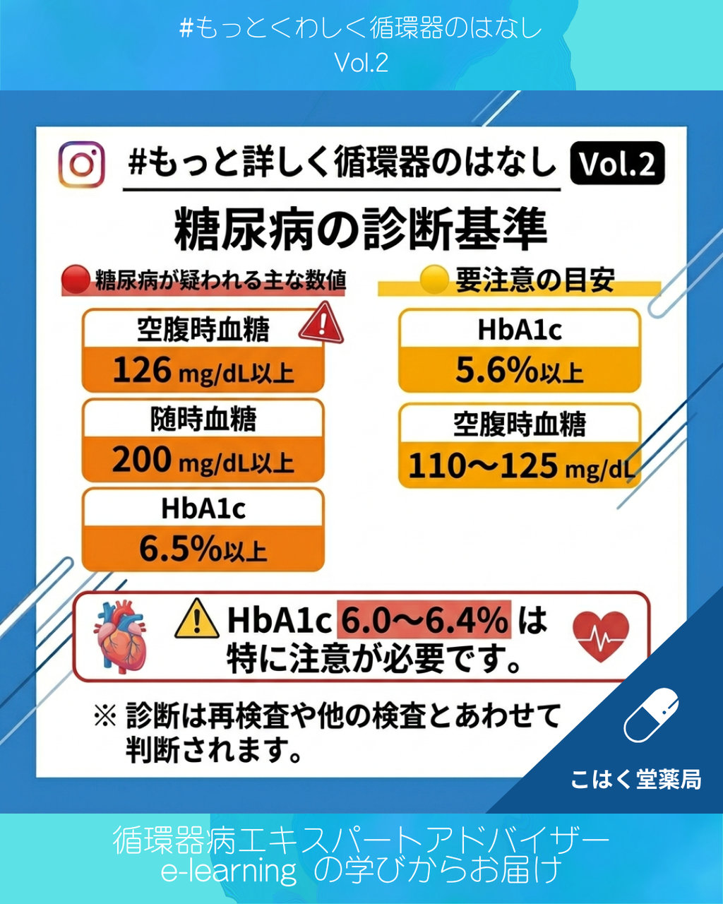 【糖尿病と心臓は、実は深くつながっています🫀】糖尿病というと、「血糖値の病気」というイメージが強いかもしれません。でも実は、糖尿病は心筋梗塞・脳卒中・心不全 のリスクを高める、循環器とも深く関わる病気です。しかも、糖尿病と診断される前の予備群や血糖高めの段階 でも、すでに動脈硬化や心血管リスクは高まり始めます。健診結果の HbA1c、最近見ていますか?5.6%以上は要注意、6.5%以上は受診を考える目安 です。詳しくはスライドをスワイプ👉#糖尿病 #HbA1c #血糖値 #動脈硬化 #循環器病#薬局 #こはく堂薬局 #健康寿命 #生活習慣病 #心筋梗塞 #予防医学 #健康情報
