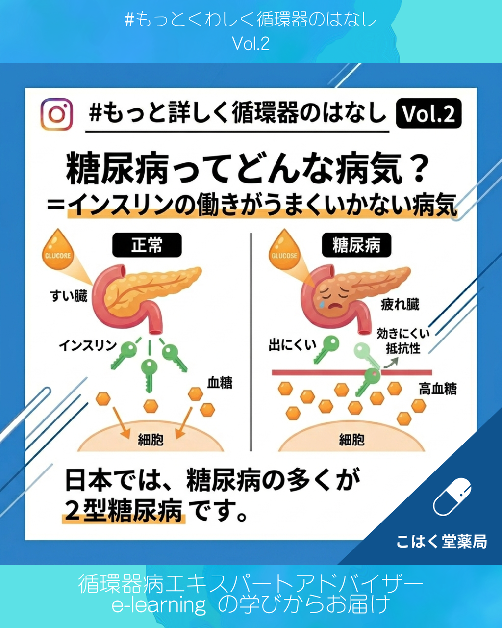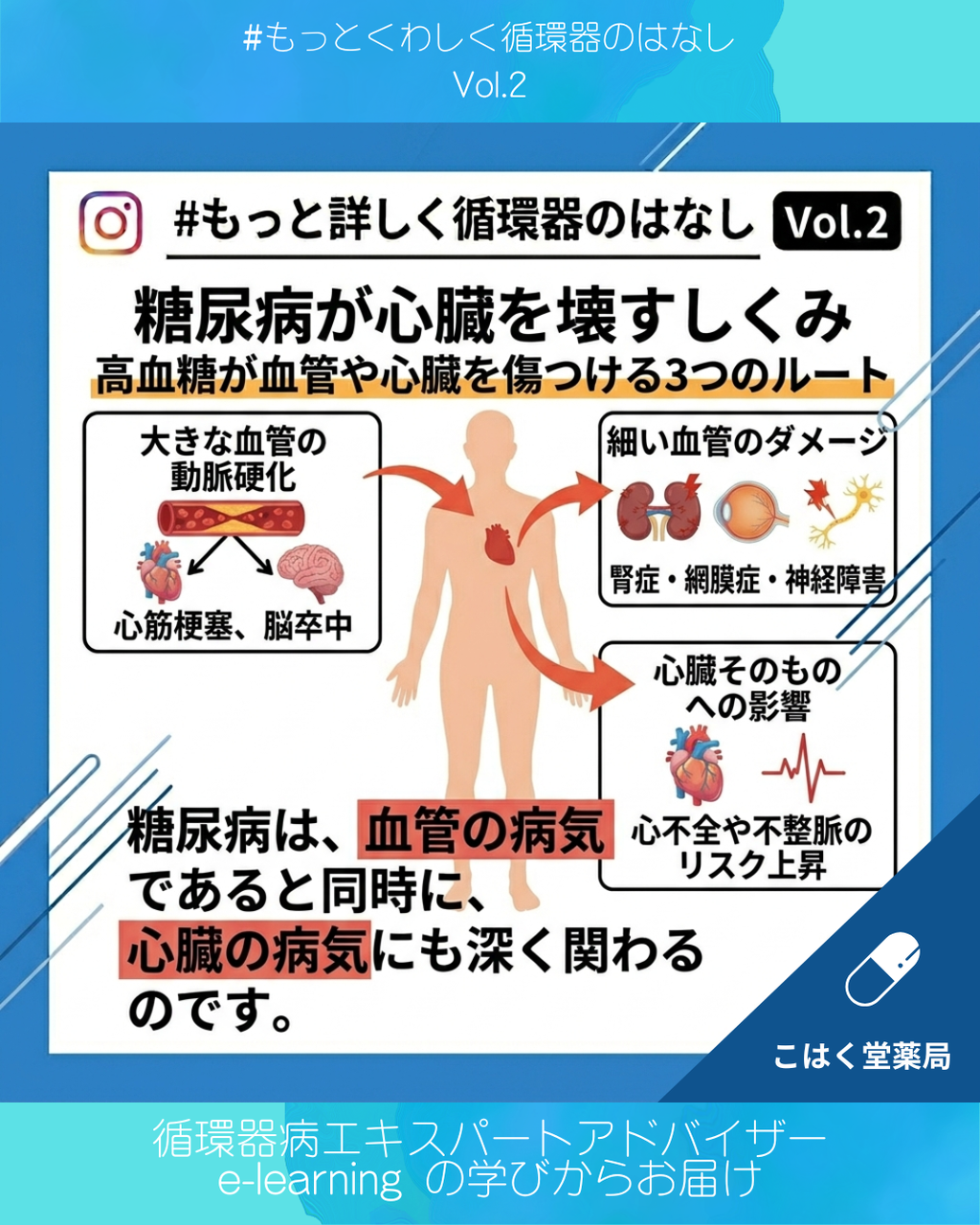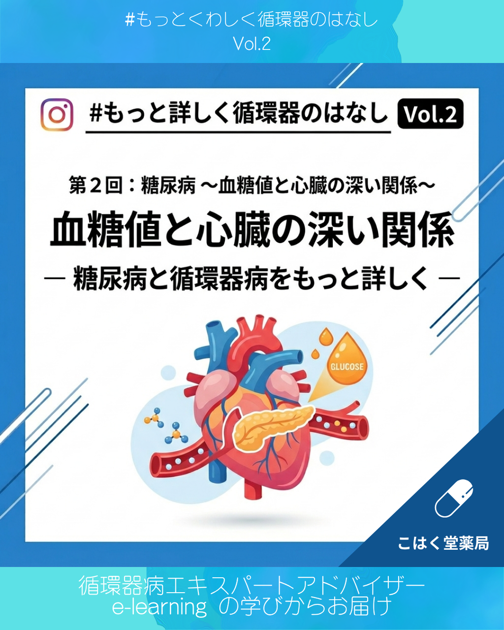 【糖尿病と心臓は、実は深くつながっています🫀】糖尿病というと、「血糖値の病気」というイメージが強いかもしれません。でも実は、糖尿病は心筋梗塞・脳卒中・心不全 のリスクを高める、循環器とも深く関わる病気です。しかも、糖尿病と診断される前の予備群や血糖高めの段階 でも、すでに動脈硬化や心血管リスクは高まり始めます。健診結果の HbA1c、最近見ていますか?5.6%以上は要注意、6.5%以上は受診を考える目安 です。詳しくはスライドをスワイプ👉#糖尿病 #HbA1c #血糖値 #動脈硬化 #循環器病#薬局 #こはく堂薬局 #健康寿命 #生活習慣病 #心筋梗塞 #予防医学 #健康情報
