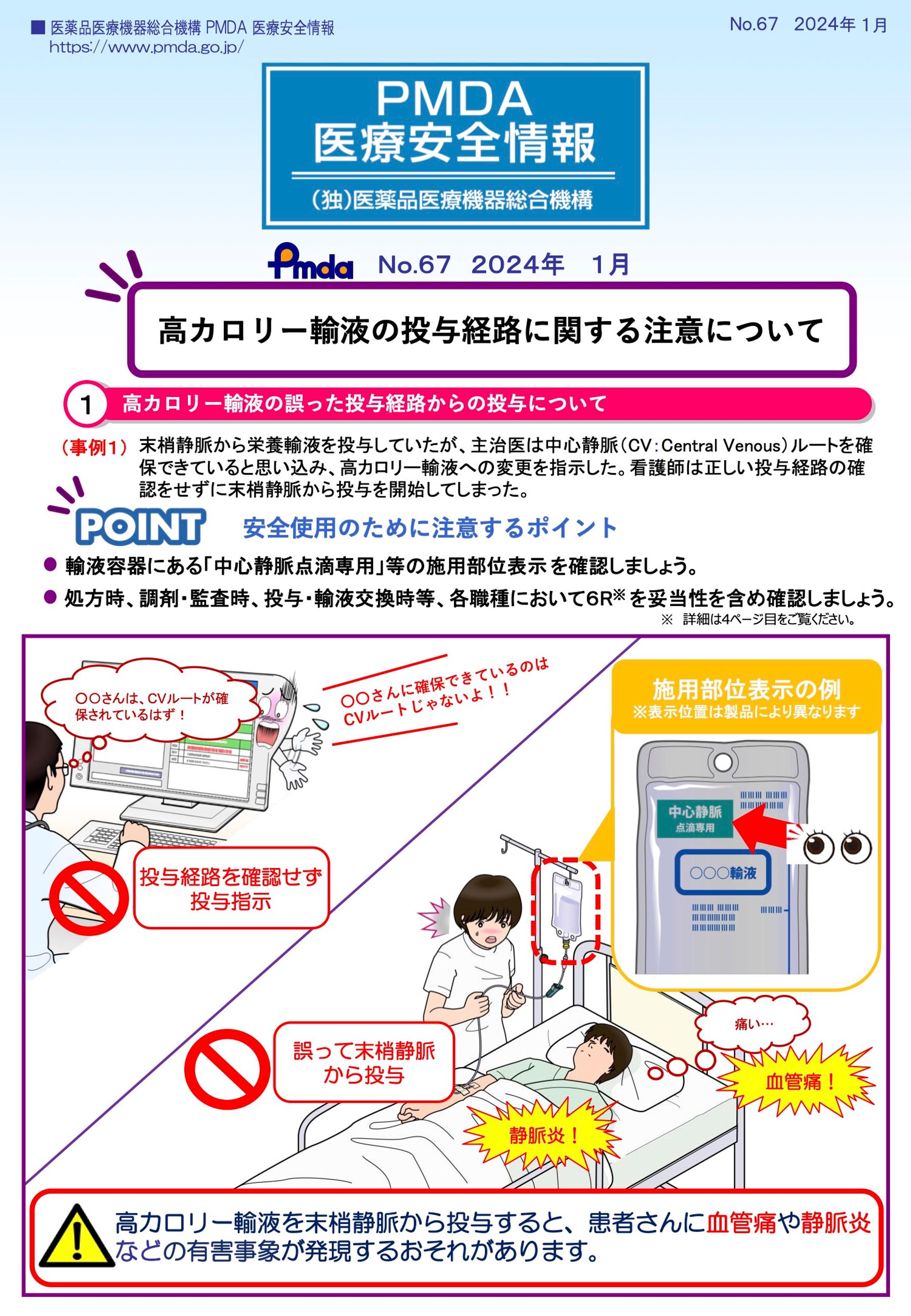 PMDA医療安全情報:「高カロリー輸液の投与経路に関する注意について」、No. 67、2024年1月.